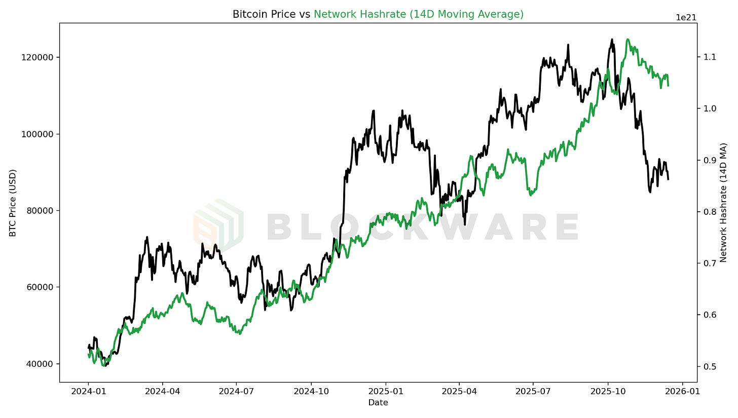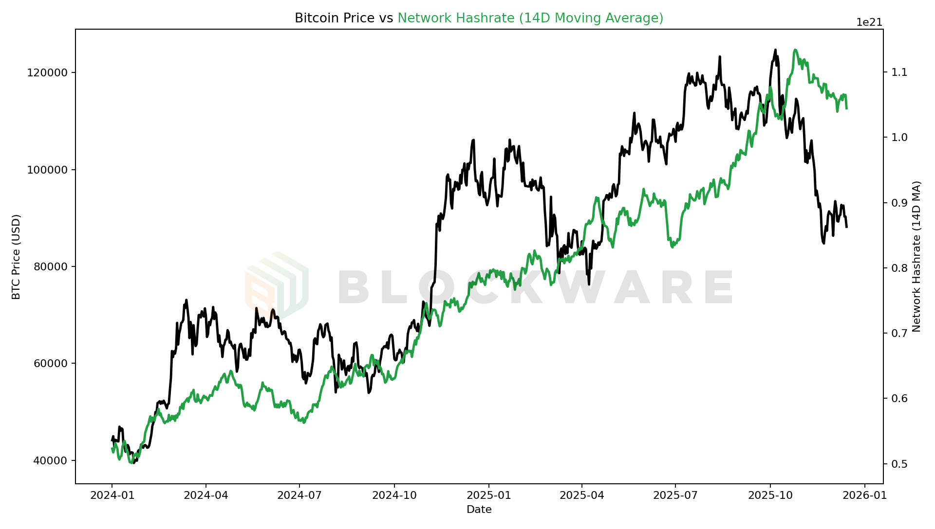 The Bitcoin Network Hashrate (as measured by the 14-day moving average) is down ~8% from its peak in late October. This means BTC miners are mining ~8% more Bitcoin on average compared to October. Having miners online during times like this can significantly amplify long-term returns. Blockware positions their clients for success during these times in two ways: