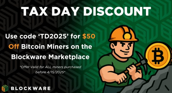 Between now and Tax Day (April 15th), use the code ‘TD2025’ at checkout for $50 off on the Blockware Marketplace. The $50 credit will be applied to your next month’s hosting bill for each miner purchased.