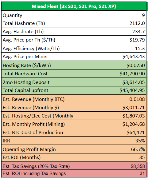 In this analysis we’ll assume a diversified portfolio of three different miner models — S21, S21 Pro, and S21 XP — creating a balanced mix of efficiency, output, and cost.