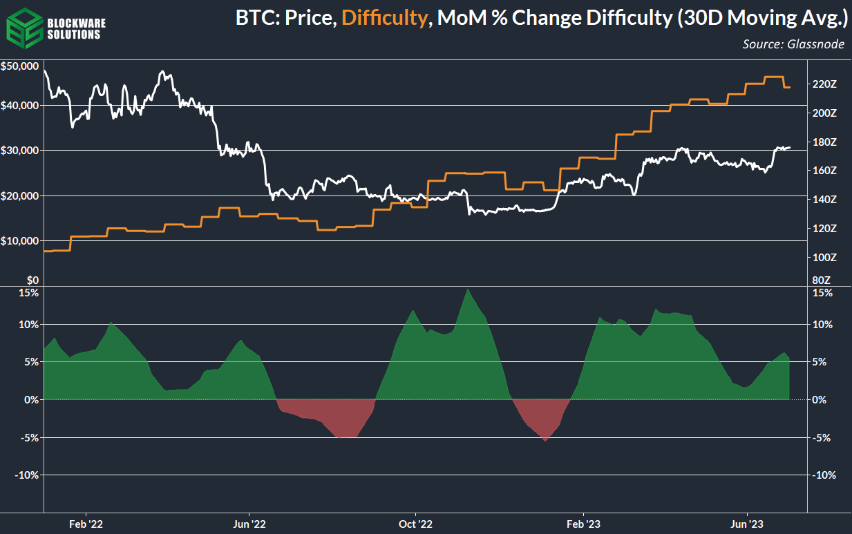 Difficulty adjusted down -3.26%, the 4th downward difficulty adjustment of the calendar year. The month over month growth rate of difficulty is down significantly from its 2022 peak. The reason for the slowing growth rate of difficulty is ASIC commoditization, as well as the fact that mining investment made during the last bull market has all been plugged in.