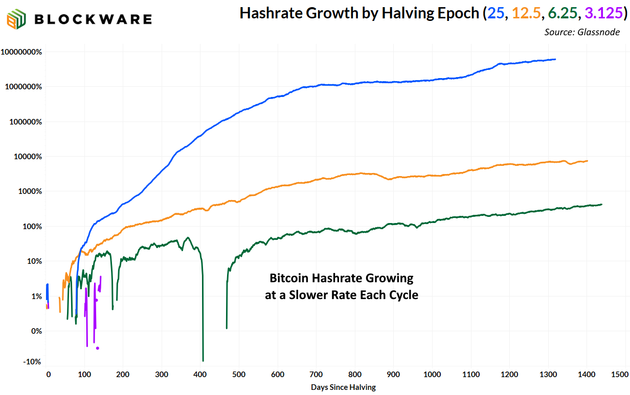 After this adjustment, mining difficulty will, in total, be ~8% higher than where it was at the time of the halving. Right now, hashrate is growing at a slower pace than it did at this point during previous cycles. It’s obviously early into the cycle, but our hypothesis on slowing hashrate growth is playing out so far.