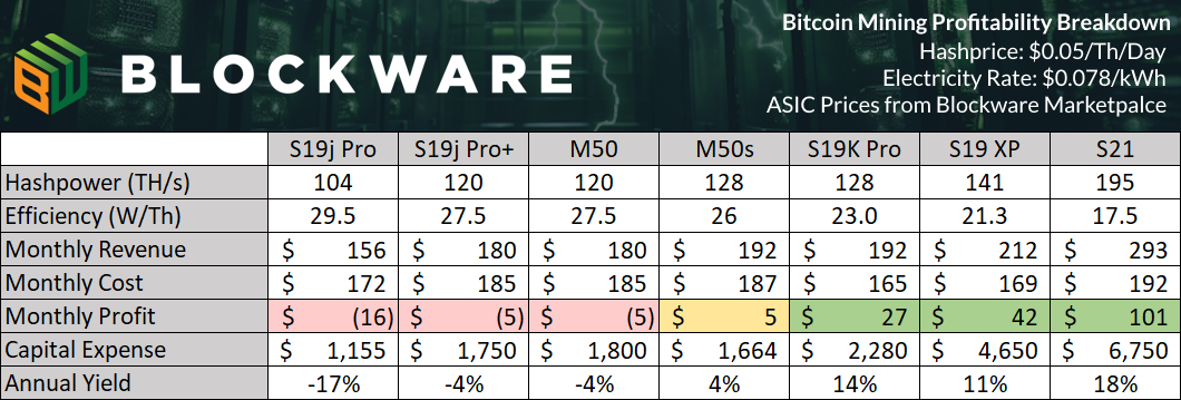 The table below shows the monthly profit for various ASICs based on the current hashprice at an electricity rate of $0.078/kWh.