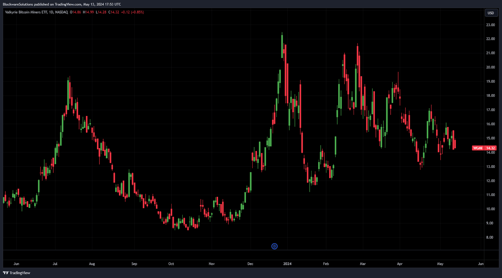 Just as BTC has consolidated, so have the publicly traded mining companies. $WGMI, the mining stock ETF, is forming a bull flag. The 13-14 point range seems to be a support level.