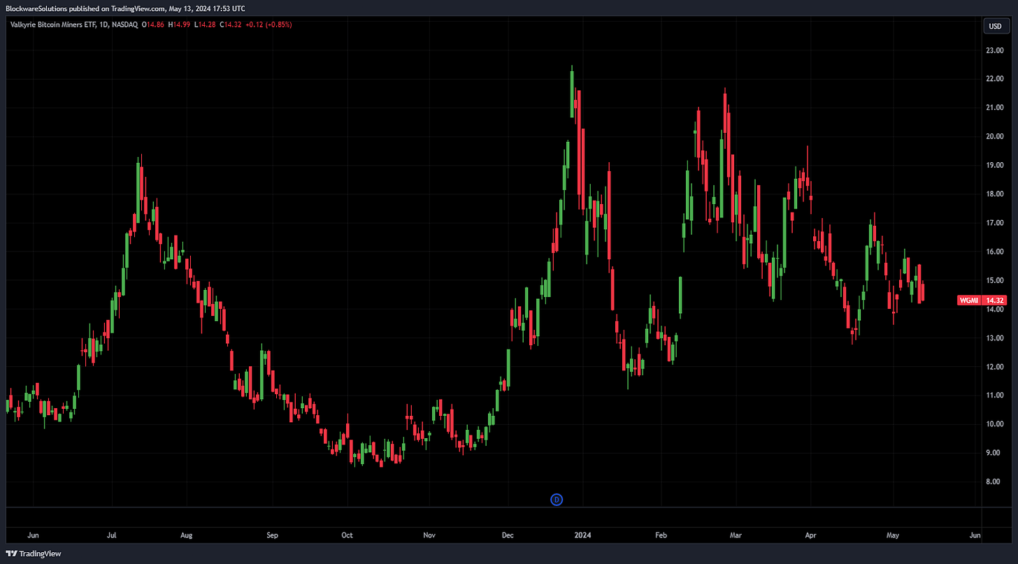 The market appears to be unsure how to price the mining stocks. They plummeted leading up to the halving, pumped immediately after, and now they’ve traded sideways since then.