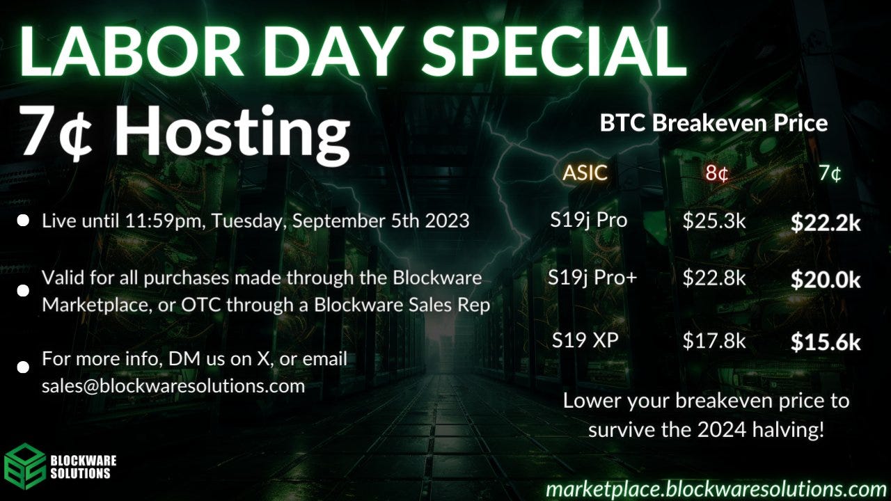 Our Labor Day promotion is about to end! If you purchase an ASIC before the end of the day tomorrow, you will secure a 7¢ per kWh hosting rate. This will lower your monthly operating costs by 12.5% compared to an 8¢ rate; factor that across a few dozen machines and you’ll save thousands of dollars each month.