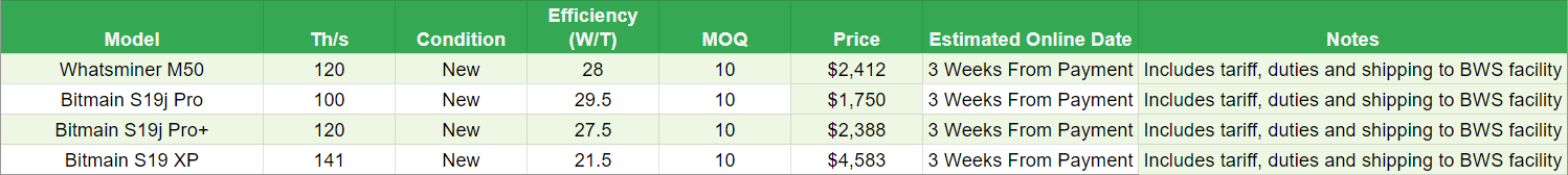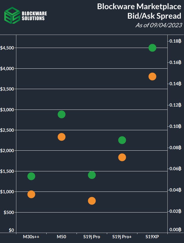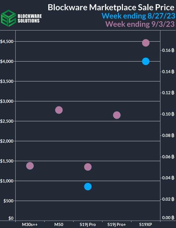 Below are the lowest current listing prices (asks) on the Blockware Marketplace for a variety of popular ASIC models, including the week-over-week change: