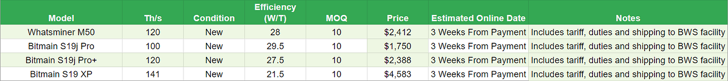 Machine prices have effectively gone unchanged since the past week. The large increase in the S19j Pro price is a result of a low priced machine that sold very quickly the previous week.