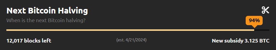 We are now 94% of the way through the current halving epoch, with the 2024 halving projected to occur on April 21, 2024.