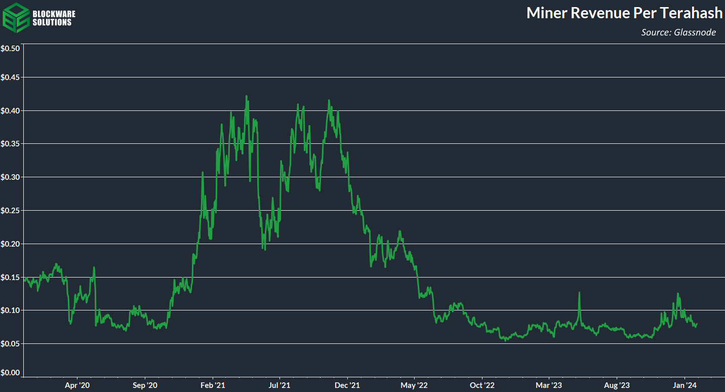 Hashprice is hovering around $0.08/TH/Day. Barring a significant increase in the price of BTC between now and April, the halving will put pressure on the weakest (high energy cost, inefficient ASICs) Bitcoin miners on the network.