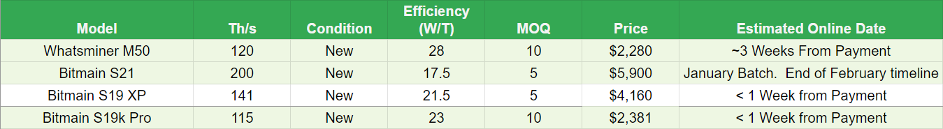 We can help you secure all of the top ASICs currently on the market; Antminer S21s, S19 XPs, S19k Pros, and Whatsminer M50s.