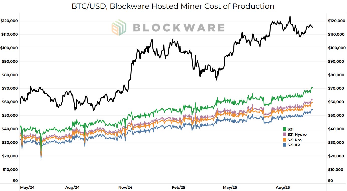 Mining difficulty is up ~4% this month, but miners hosted with Blockware are still producing BTC well below the current market price. Here’s the ‘Breakeven’ / ‘Cost of Production’ price per BTC for different miner types hosted with Blockware:
