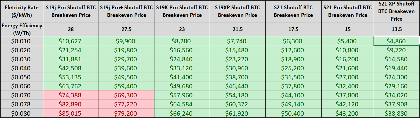 The table below shows the breakeven Bitcoin price for different ASICs based on electricity rate. Or in other words, how much in electricity does it cost to mine 1 BTC.