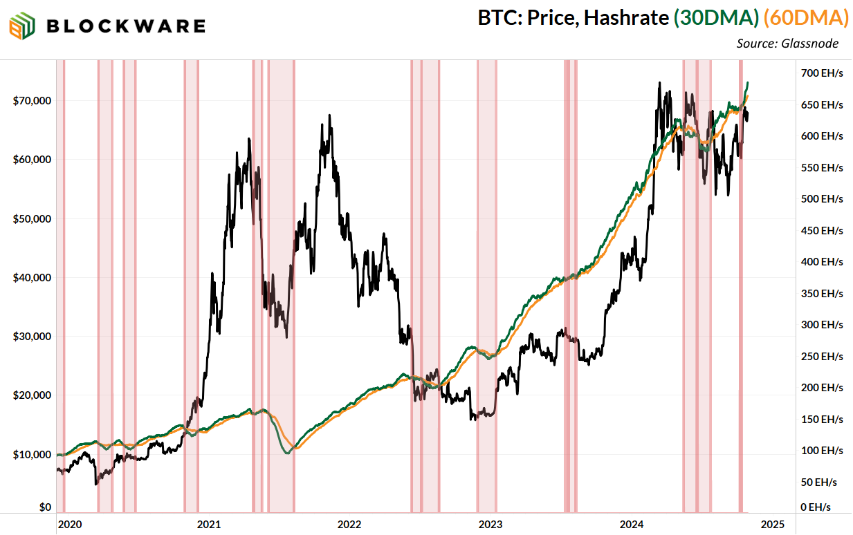 The ‘Hash Ribbon’ indicator flashed in earlier this month but has since closed. This occurs when the 30-day moving average of hashrate crosses below the 30-day moving average. Or in other words, Bitcoin miners are unplugging machines in the aggregate.