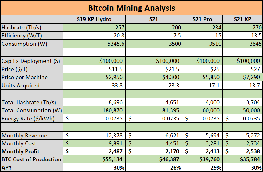 Here’s a table juxtaposing the economics of a $100,000 deployment into BTC mining based on different machine types. The projected APY ranges from 26% to 30% for each of the models shown.