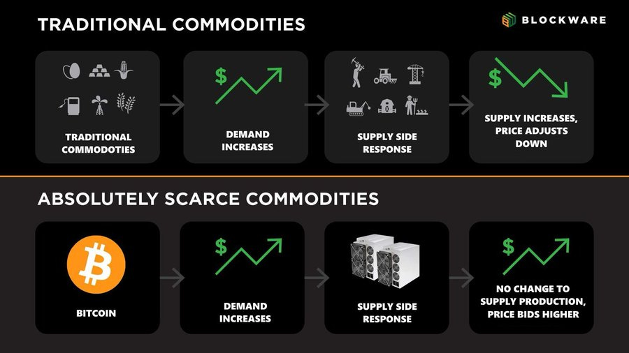 BTC is the ONLY asset whose supply cannot increase in response to an increase in demand. No matter how much demand for BTC there is, the total supply of BTC will never exceed 21,000,000. Moreover, all 21,000,000 BTC will not enter the market faster or slower than the supply schedule set forth at Bitcoin’s genesis in 2009.