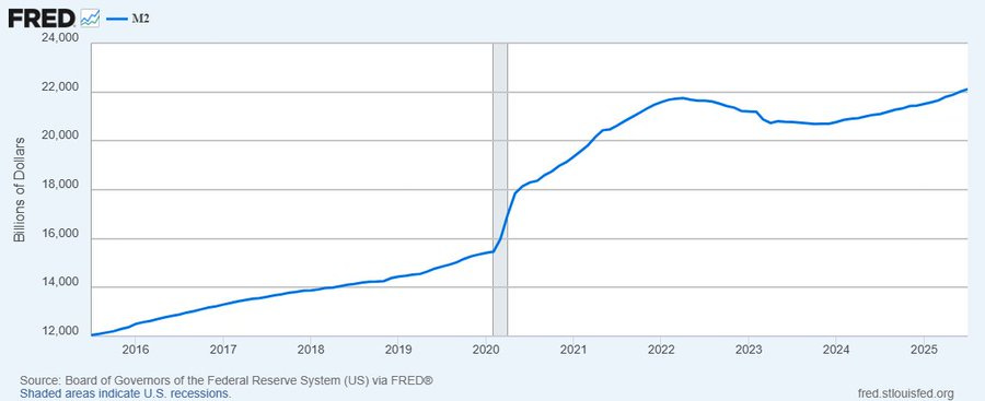 Capturing part of the TAM Pie isn't the only way BTC's market cap can increase. The entire size of the pie is growing as well. The supply of dollars has increased by ~7% per year since 1960. M2 has doubled in the past 10 years alone. As more units of currency enter the system, demand for Store of Value assets (including BTC) increases.