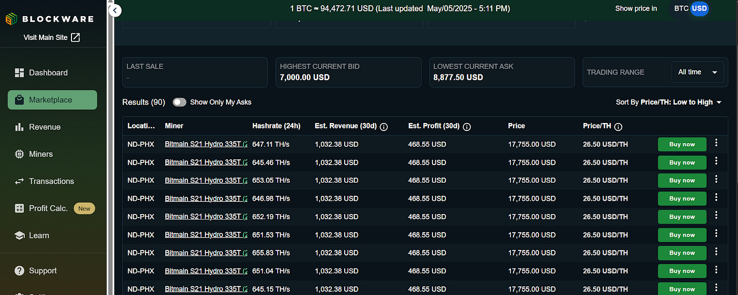 Click here to check out our Marketplace where you can see real-time analytics on our miners, and make an immediate purchase using BTC or fiat. The latest miner added to the Blockware Marketplace is the Antminer S21 Hydro. A single unit is profiting >$400 per month.